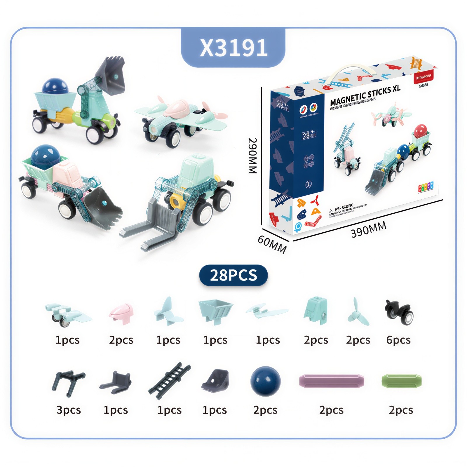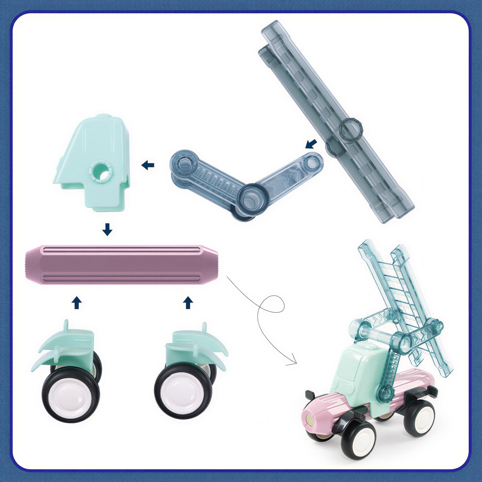 Dílky se snadno spojují pomocí silných magnetů , díky čemuž mohou děti vytvářet různé tvary, domečky, věže, hrady či originální umělecká díla. Magnetická stavebnice spojuje zábavu, kreativitu a estetiku, rozvíjí jemnou motoriku , představivost a smysl pro krásu.